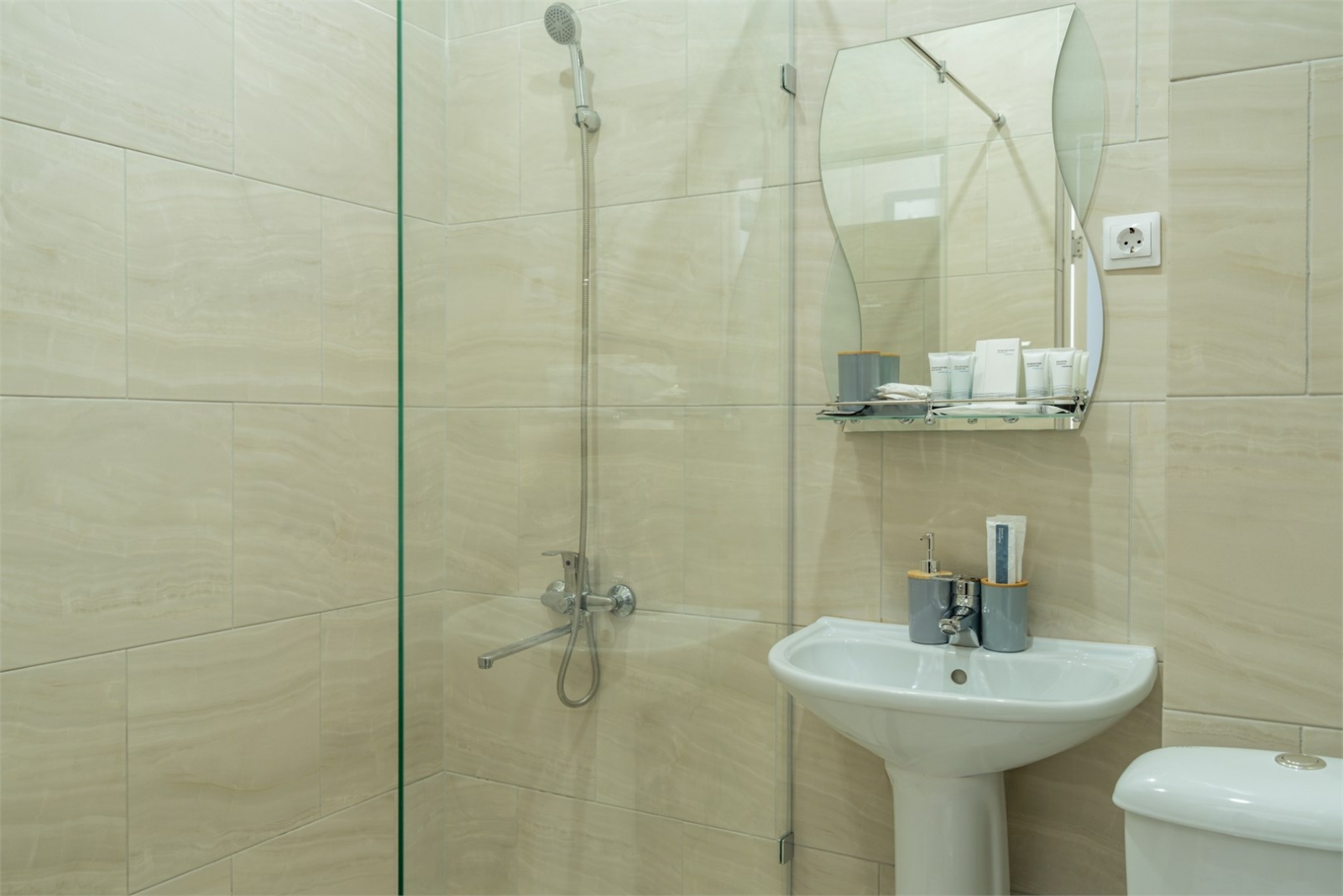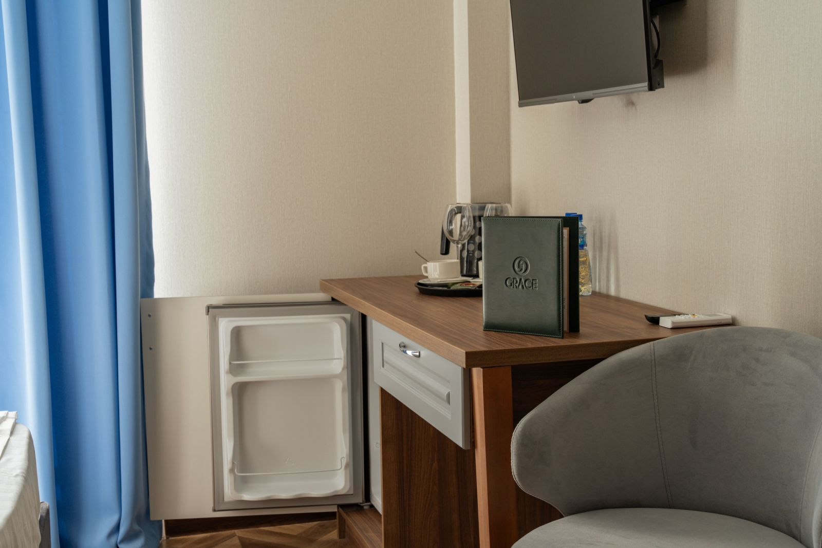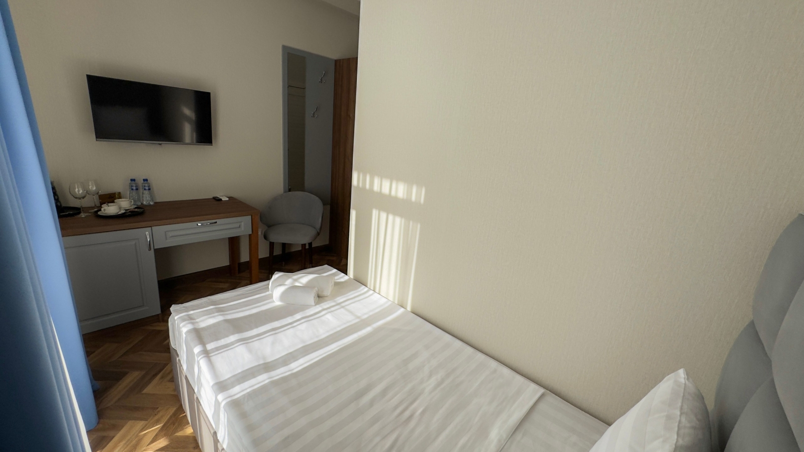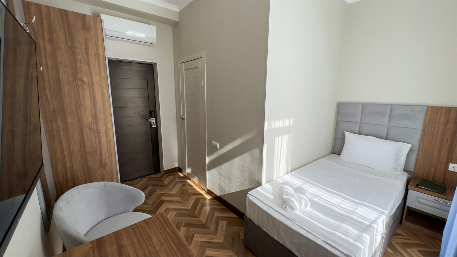 Площадь номера - 9 кв.м. 1 осн. место. Балкон. Мебель: вешалка, зеркало, кровать односпальная, прикроватная тумбочка, стол, стул, шкаф. Оборудование: кондиционер, мини-холодильник, телевизор. Санузел: с душем, тапочки, туалетные принадлежности, фен. Сервис: Wi-Fi бесплатно, смена полотенец, смена постельного белья, уборка номера.