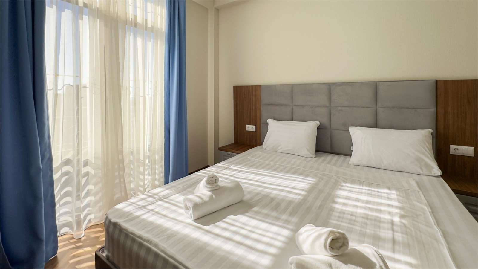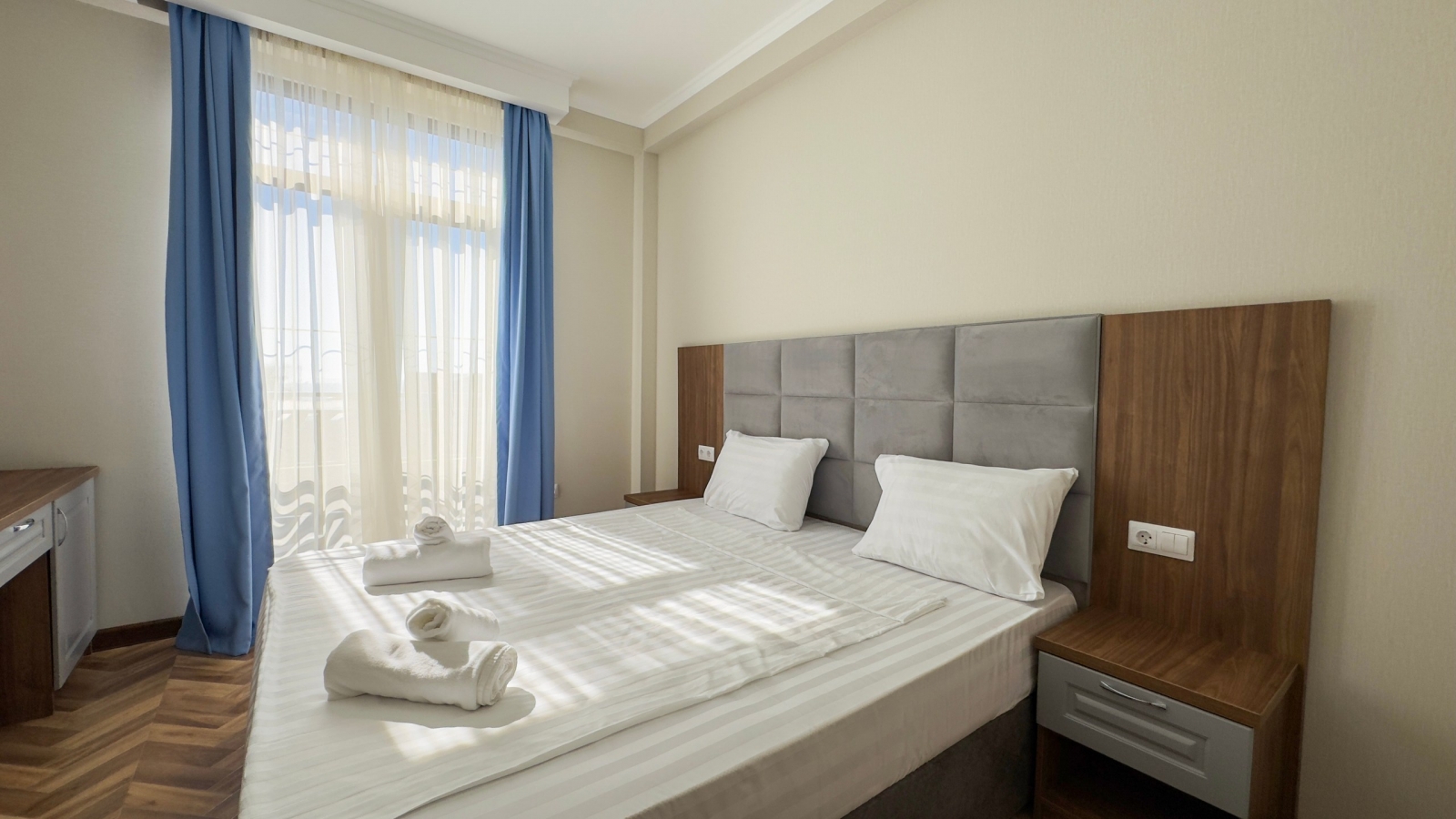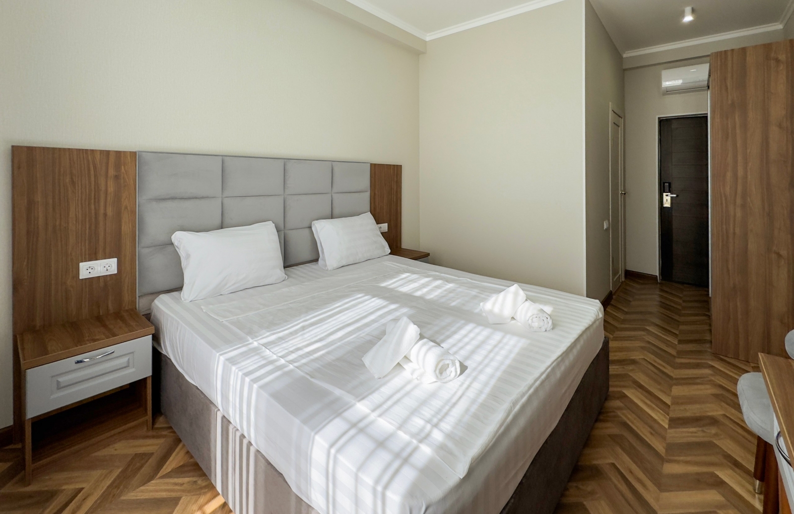 Площадь номера - 16 кв.м. 2 осн. места. Балкон. Мебель: вешалка, зеркало, кровати односпальные /одна двуспальная кровать, прикроватные тумбочки, стол, стул, шкаф. Оборудование: кондиционер, мини-холодильник, телевизор. Санузел: с душем, тапочки, туалетные принадлежности, фен. Сервис: Wi-Fi бесплатно, смена полотенец, смена постельного белья, уборка номера.