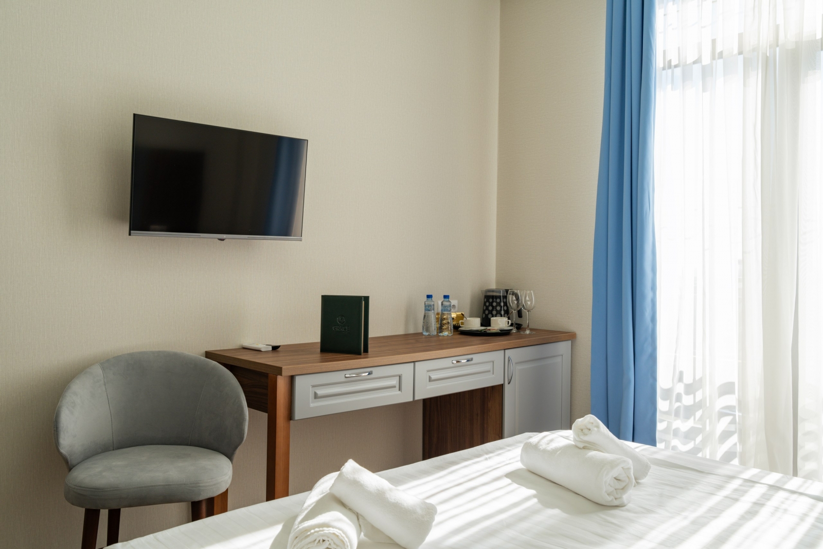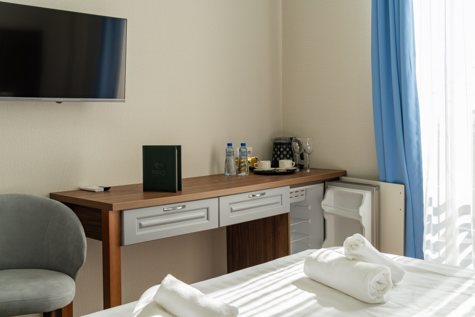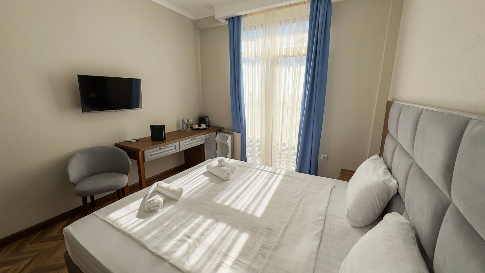 Площадь номера - 16 кв.м. 2 осн. места. Балкон. Мебель: вешалка, зеркало, кровати односпальные /одна двуспальная кровать, прикроватные тумбочки, стол, стул, шкаф. Оборудование: кондиционер, мини-холодильник, телевизор. Санузел: с душем, тапочки, туалетные принадлежности, фен. Сервис: Wi-Fi бесплатно, смена полотенец, смена постельного белья, уборка номера.