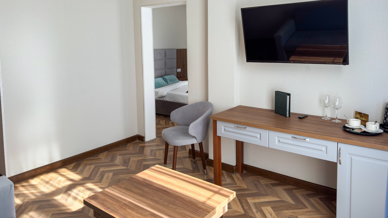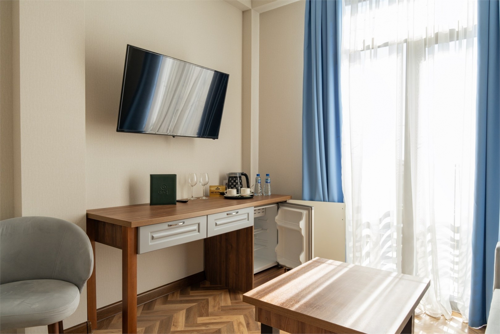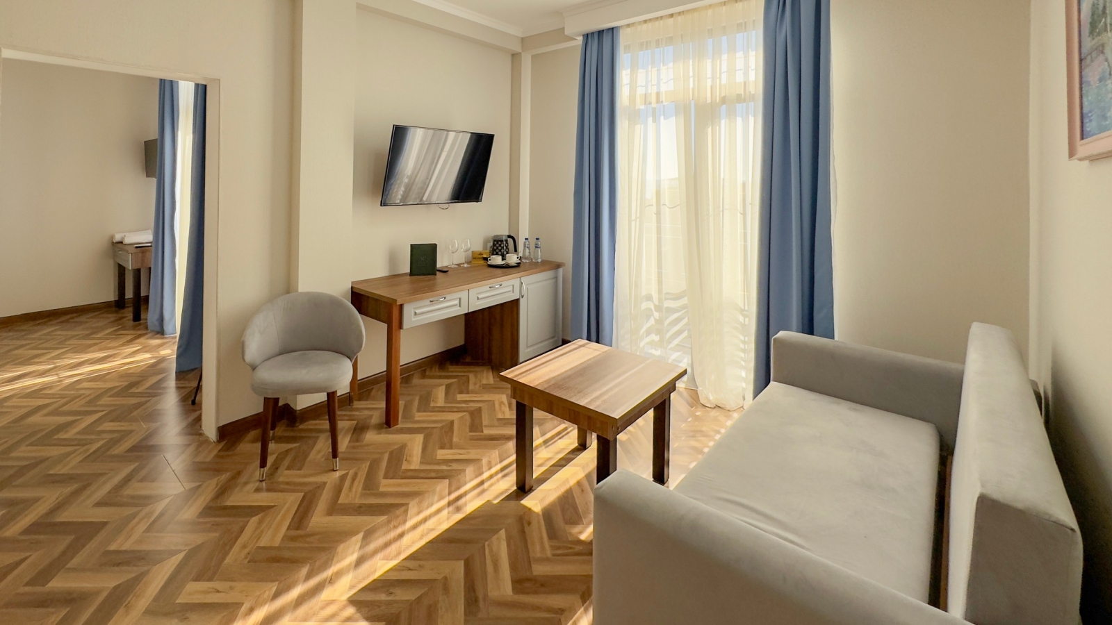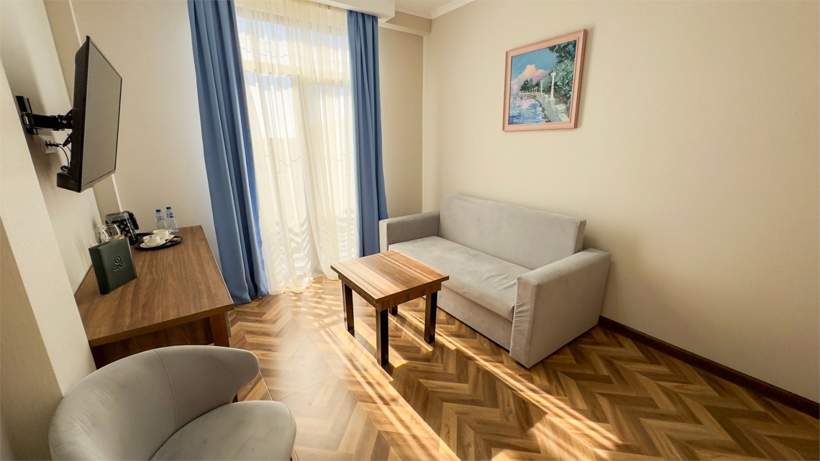 Площадь номера - 28 кв.м. 2 осн. места. 1 доп. место. Балкон. Мебель: вешалка, диван раскладной, зеркало, кровать двуспальная, прикроватные тумбочки, стол, столик журнальный, стул, шкаф. Оборудование: кондиционер, мини-холодильник, телевизор, чайная станция. Санузел: с душем, тапочки, туалетные принадлежности, фен. Сервис: Wi-Fi бесплатно, смена полотенец, смена постельного белья, уборка номера.